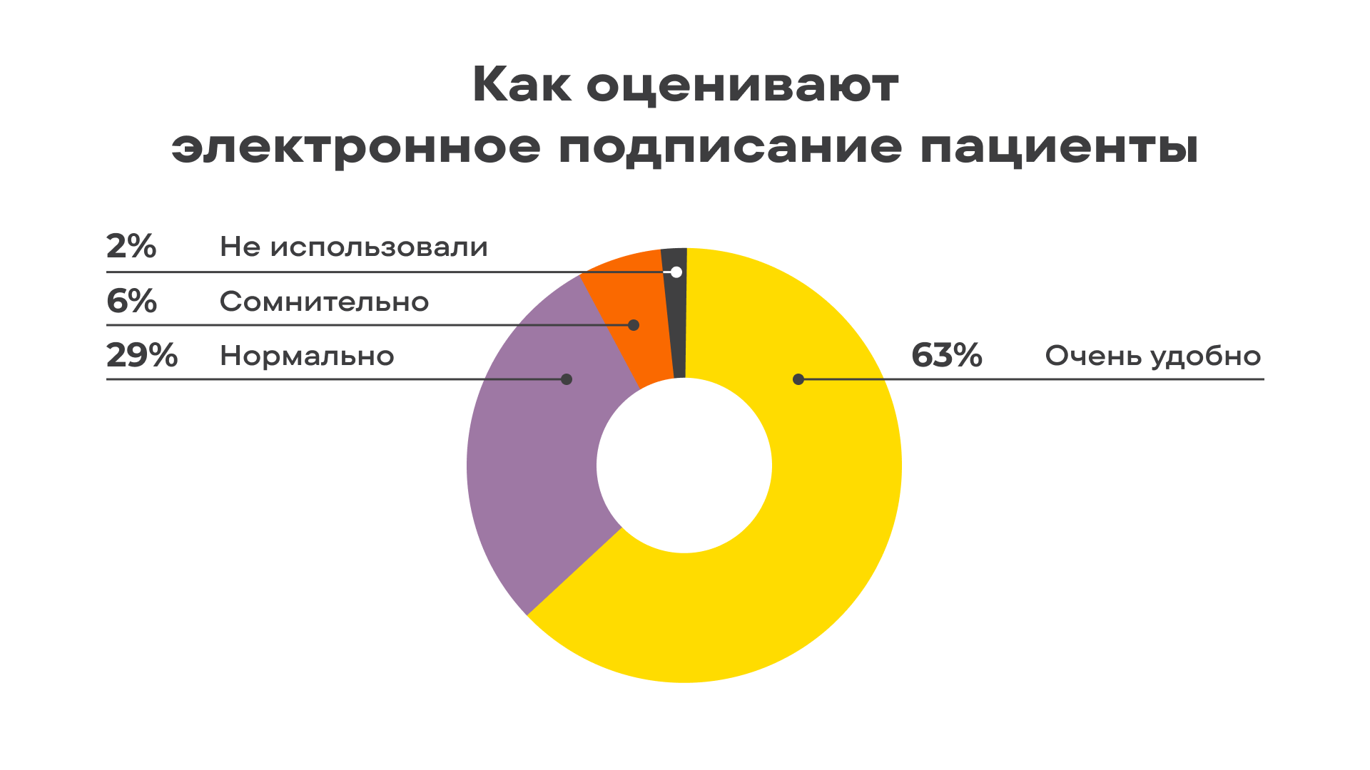 - Пациенты отмечают удобство и современность сервиса. Оценить электронное подписание можно напрямую через F.Doc, текущий показатель удовлетворенности составляет 93%. Кроме того, по результатам собственного опроса клиники, 92% пациентов удовлетворены использованием сервиса (подробности на диаграмме).